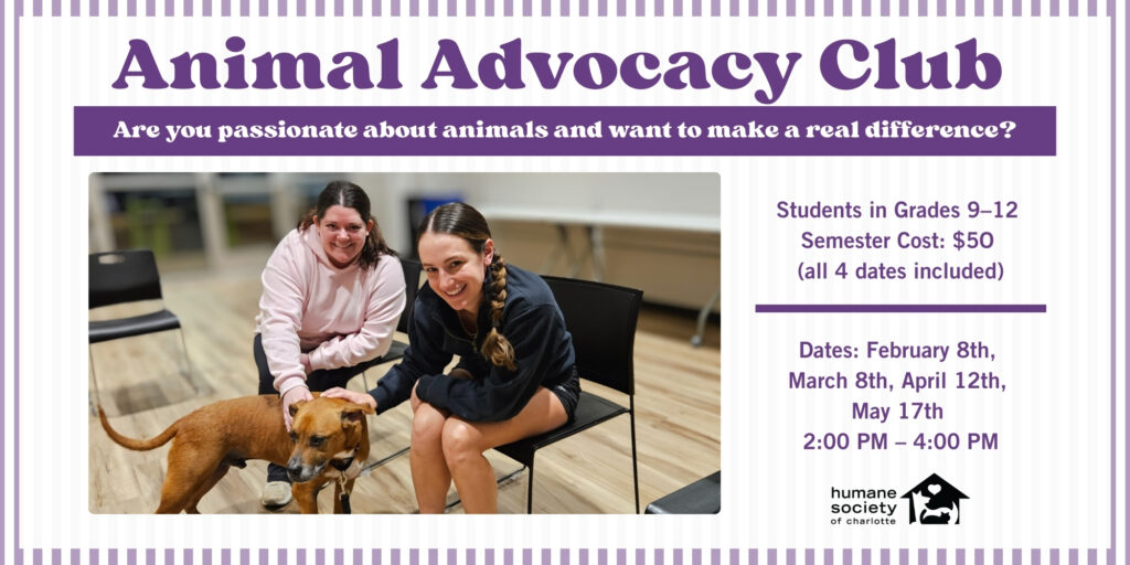 Are you a high school student who cares deeply about animals and wants to make a difference? Join the Animal Advocacy Club at the Humane Society of Charlotte- a four-month, hands-on program built just for teens ready to raise their voices for animal welfare.