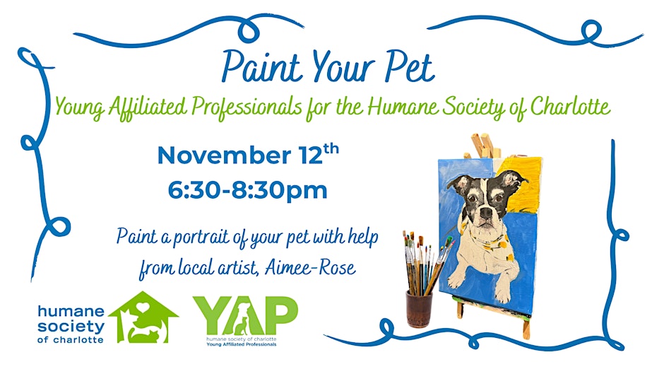 Join us for an evening of creativity, community, and compassion as we come together to support the Humane Society of Charlotte! This special Paint Your Pet event, hosted by the Young Affiliated Professionals (YAP), is the perfect way to celebrate your furry friend while giving back to a great cause.